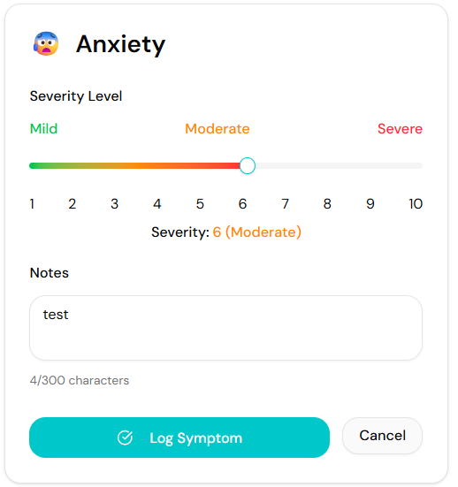 - Severity Scale: Rate symptoms using 1-10 slider (1=mild, 5=moderate, 10=severe)